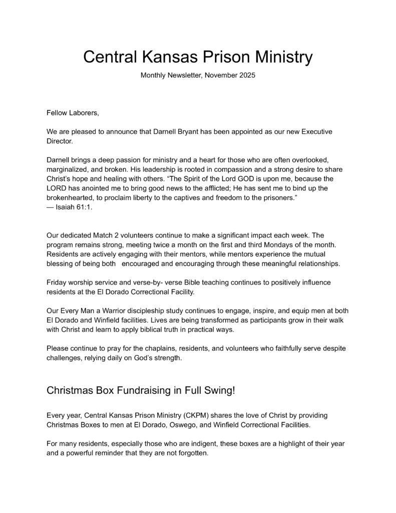 If you would like your prison ministry listed, contact our office – 316-733-1537 or email the executive director: [email protected]